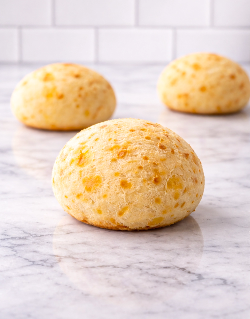 Cheese bread, or “pão de queijo” in Portuguese, is a small, round Brazilian bread roll. It’s unique for its chewy, soft texture and rich cheese flavor. Made with tapioca flour, eggs, oil, and grated cheese, these gluten-free rolls are crisp on the outside and airy on the inside.